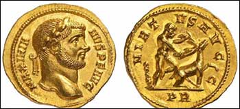 Złoty aureus cesarza maksymiana z mennicy w Rzymie z roku 287. Awers: MAXIMIA-NVSPFAVG, głowa cesarza w wieńcu laurowym w prawo. Rewers: VIRT-VSAVGG, Herakles łapiący łanię kerynejską, z -lewej maczuga. Na odcinku: PR.